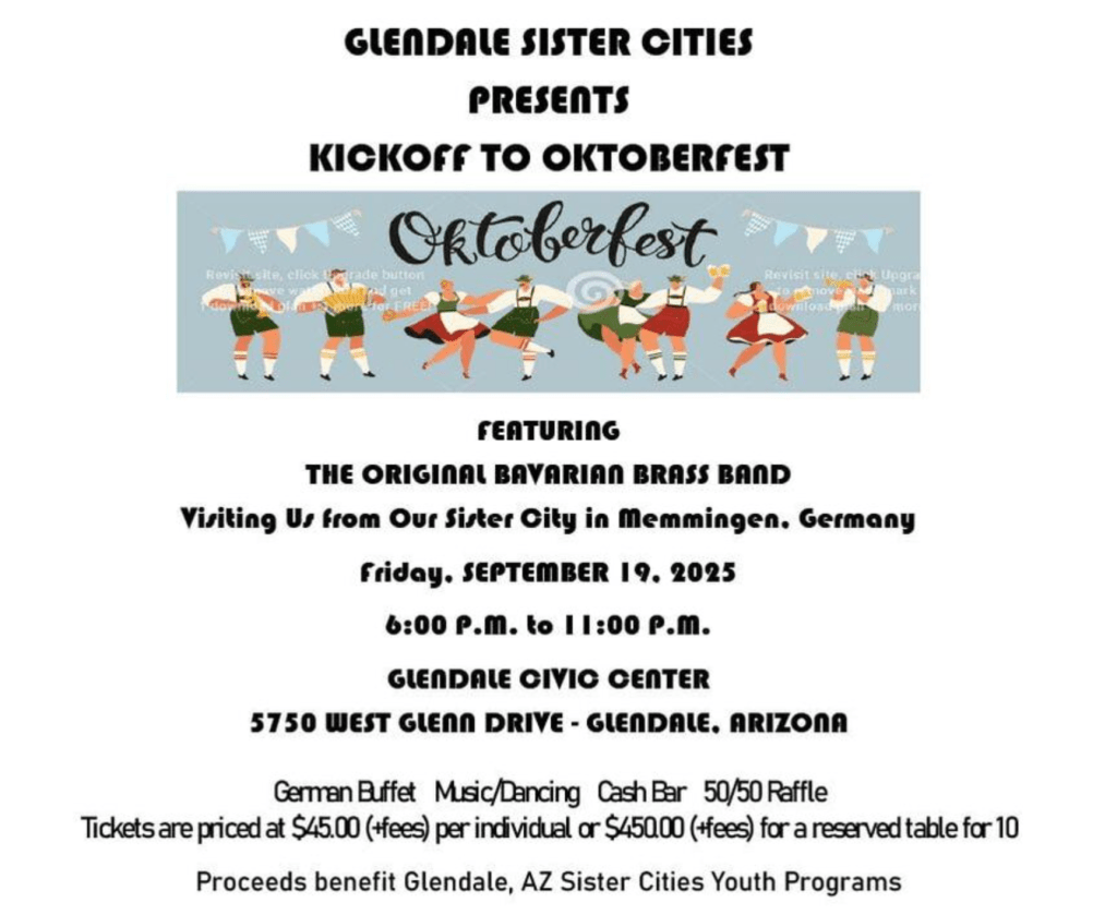 Glendale Sister Cities would like to invite you to their inaugural “Kick Off to Oktoberfest” fundraising event on Friday, September 19, 2025. The event will feature The Original Bavarian Brass Band, a 22-piece brass band from their Sister City in Memmingen, Germany! They have performed at Oktoberfest in Munich, Germany as well as here in the United States, especially at numerous locations in Texas. In fact, in Texas, they are lovingly known as the Bavarian Texas Band thanks to the large German population in Texas and the band’s popularity there! This is their first trip to Glendale, and Glendale Sister Cities is excited to introduce them to Glendale and surrounding communities! You may not know that Oktoberfest in Germany is held in September. This year it starts on September 20th, so this is Glendale’s way of honoring German tradition by “kicking off” their 2025 Oktoberfest season!